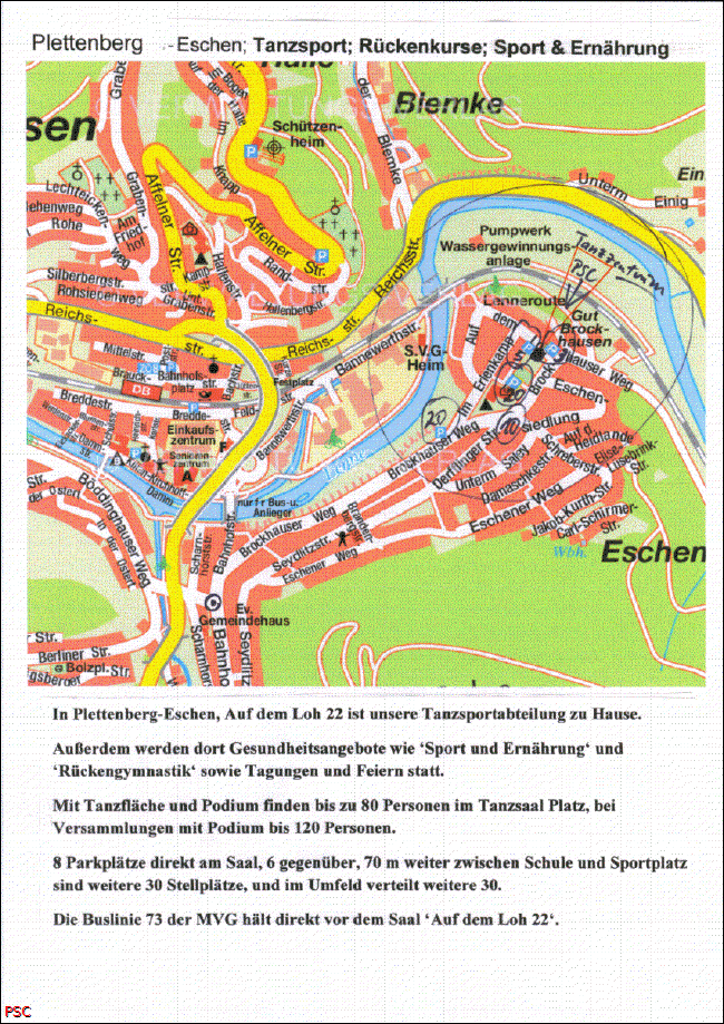 Anfahrt-Karte zum runterladen pl.eschentanzheimgesundkurse.pdf Der PSC-Flyer : psc.flyer.pdf Aufnahmeantrag: aufnahmeantrag.pdf Neue Tanzkurse neuetanzkurse.pdf * Adresse des PSC-Vereinsheim Tanzzentrum am Eschen: Auf dem Loh 22; 58840 Plettenberg-Eschen. Bus-Anfahrt: MVG Linie 73; Haltestelle "Auf dem Loh"